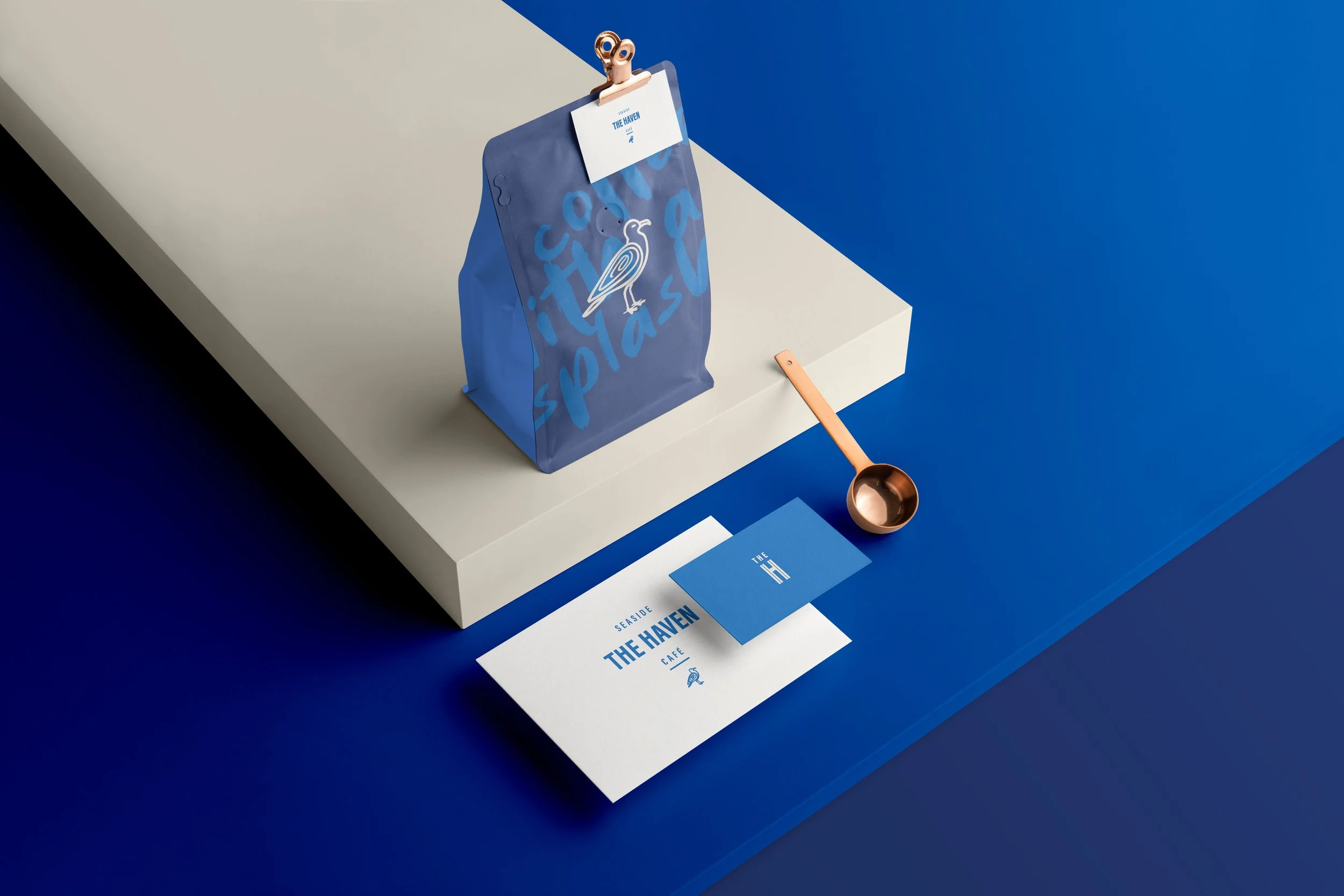 The branding for The Haven Café centers on a nautical-minimalist aesthetic that captures the serene, crisp atmosphere of the seaside. Utilizing a sophisticated high-contrast palette of cobalt, navy, and sandy cream, the visual language relies on clean, geometric lines and generous negative space to evoke a sense of calm. The primary identity is anchored by a stark, tall-capped sans-serif typeface and a simple seagull icon, while secondary typography features a fluid, hand-drawn script—"coffee with splash"—that adds a touch of organic, coastal movement. Through a balance of structured grid layouts and textural photography of sand and coffee beans, the brand successfully positions itself as a premium, modern retreat that is both grounded and refreshing.